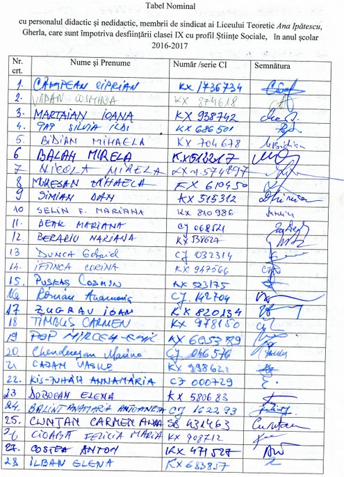 Colectivul cadrelor didactice, membre de sindicat,al Liceului Teoretic Ana Ipătescu, colectivul elevilor majori, și reprezentanți ai părinților și ai societății civile se sesizează cu privire la decizia ISJ CJ, transmisă nouă prin directorul liceului Radu Ielcean, de a se lua o clasă de liceu (sectia Stiinte-Sociale inclusă din traditie în planul de învățământ, al liceului nostru), începând cu anul școlar 2016-2017 și integrarea ei în planul de școlarizare al Liceului Petru Maior, precum și cu privire la perspectiva anunțată de ISJ CJ, de desființare a nivelului liceal, care ar urma să treacă integral la Liceul Petru Maior, într-un orizont de timp nu prea îndepărtat, schimbări semnalate și în presa gherleană.